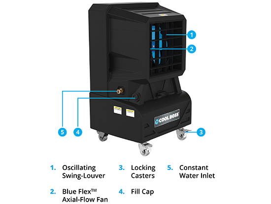 A 12” diameter Blue Flex™ axial-flow fan powered by a 1/3 HP motor propels the cooled air outward to the directed area. Select any level of cool air volume you wish from three fan-speed settings up to 1,600 rpm.