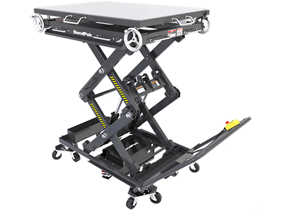 BendPak’s revolutionary Mobi-EVS™ line of full-rise battery powered mobile scissor lift tables are perfectly suited for Electric Vehicle Service and EV Battery Pack replacement. The EVS4500 boasts a 4,500-lb. lift capacity and features a compact design which can be easily transported anywhere in the workplace, making them ideal for multi-bay facilities or workplaces with confined areas.